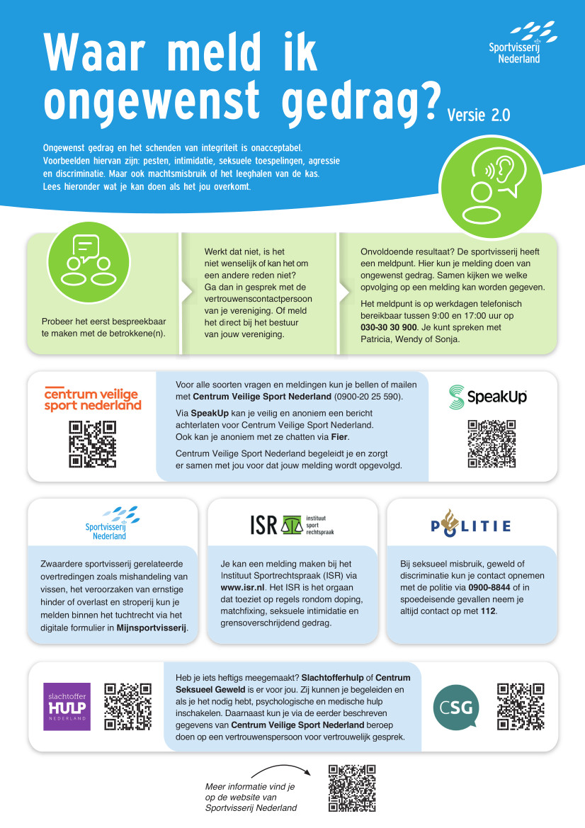 Bij HSV De Streyenvissers draait alles om plezier in de hengelsport. Of je nu jong of oud bent, recreatief vist of fanatiek wedstrijden vist – we willen dat iedereen zich welkom en veilig voelt binnen onze vereniging. Toch kan het gebeuren dat je te maken krijgt met ongewenst gedrag, zoals pesten, discriminatie, intimidatie of andere vervelende situaties.